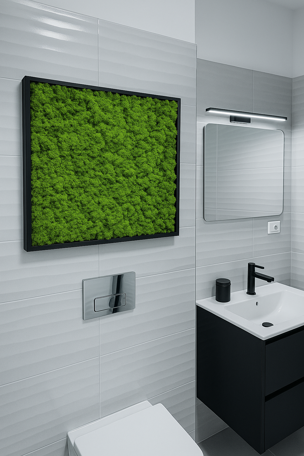 Adaugă o notă naturală și elegantă în orice spațiu cu acest tablou realizat din licheni stabilizați, 100% naturali. Fiecare bucată este lucrată manual, într-o ramă minimalistă de culoare neagră, ideală pentru băi moderne, birouri, livinguri sau spații comerciale.