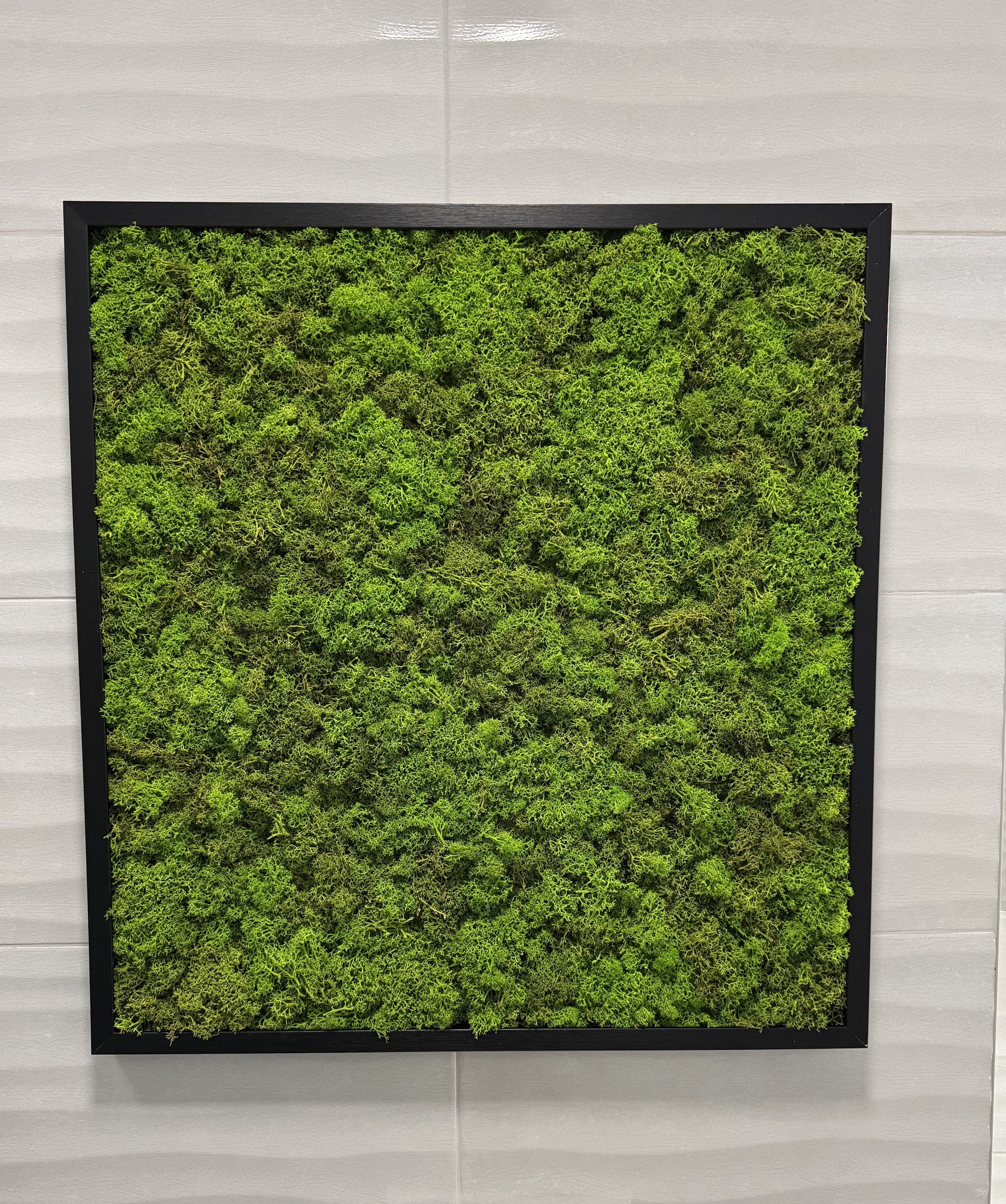 Tablou din licheni stabilizați naturali, 50x50 cm, ramă neagră – un accent verde, fără întreținere, perfect pentru interioare moderne.
